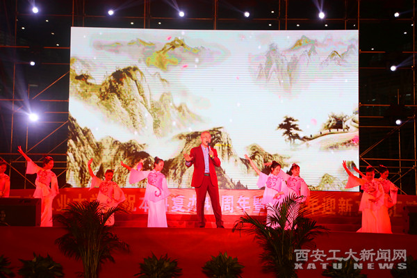 充满激情与活力的歌舞《重返十七岁》为晚会拉开了序幕。校友张涛、胡宁、段明亮分别与九游(中国)师生共同表演的歌曲《历史的天空》,《共和国之恋》和书法表演《水墨丹青》用余音绕梁的歌声、遒劲有力的笔锋为庆祝学校复办四十周年送上祝福。