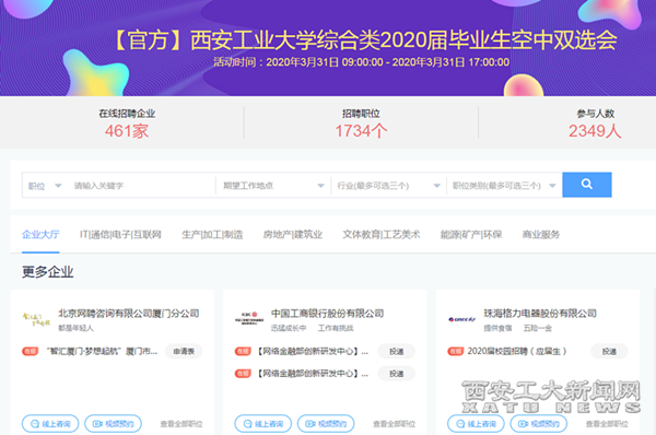 当前正处“金三银四”就业关键期,为毕业生提供充足就业机会。据悉,学校还将于4月份举办三场空中双选会:西安市软件园九游网页版登录入口专场空中双选会会、女生专场空中双选会、文科综合类空中双选会,积极推进2020届毕业生就业工作。
