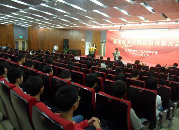 (本网讯) 9月28号下午,西安工大 2010年暑期社会实践总结表彰大会在未央校区图书馆报告厅举行。校党委副书记丁养斌出席了大会,党办、组织部、宣传部、学生处、教务处负责人及以各院系分党委(党总支)书记,分团委(团总支)书记和学生代表400余人参加了大会,大会由校团委副书记赵贵波主持。