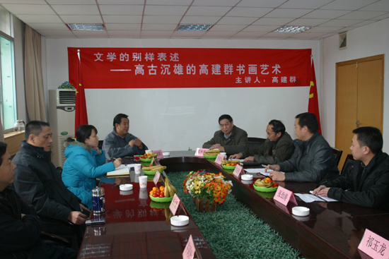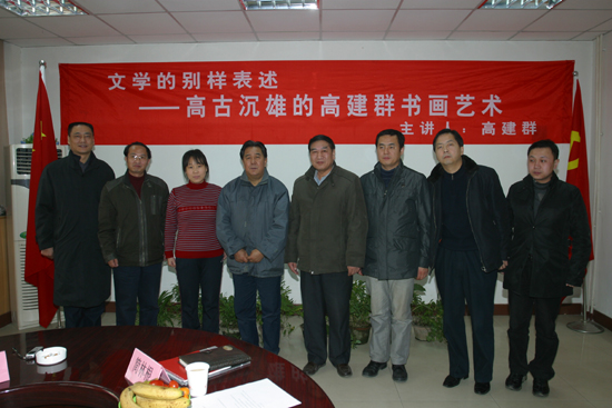 作为引发中国文坛“陕军东征”现象的重量级作家高建群先生在报告会上首先介绍了自己的新作《大平原》及其创作经历和感受。他还谈到,在文学创作之余,自己开始致力于书画艺术创作。而在这十几年的艺术积累中,形成了其独特的风格。高先生的书法,格调高古,用笔沉雄。其作品整体气势雄强,用笔老辣、浑厚,结体以魏碑为基调,融篆隶于一炉,而又不失行草的灵动。形成其文学之外的另一种话语表达形式。