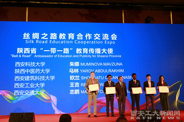 开幕式颁奖环节,九游(中国)外国留学生王吉获陕西省“一带一路”教育传播大使殊荣并接受颁奖。