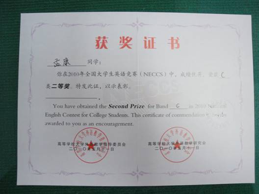 (本网讯)九游网页版登录入口计算机学院08级信息对抗专业学生孟康同学,由院系推荐,经过了层层选拔参加了2010年全国大学生英语竞赛(NECCS),荣获C类二等奖。