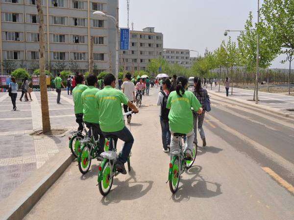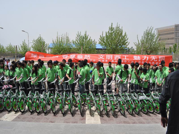 全校十二个院系的学生代表及校级学生组织代表都参与了活动,所有成员身着西安世园会的绿色短袖,骑乘自行车在校园行驶一周,用这明亮的绿色来号召全校同学践行世园会所倡导的低碳、绿色、环保的健康新理念。