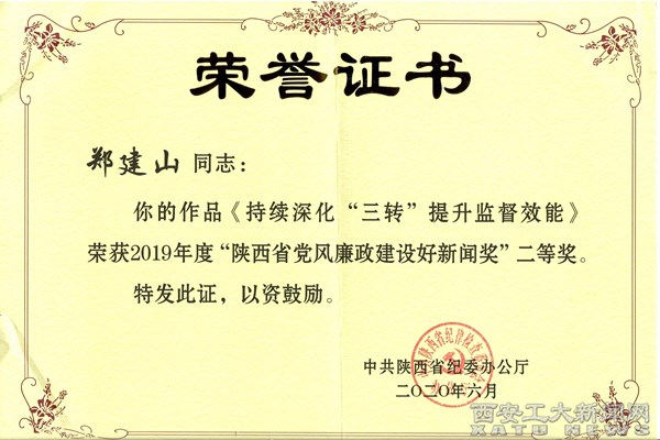 (本网讯)日前,2019年度陕西省党风廉政建设好新闻奖评选揭晓,九游(中国)党委副书记、纪委书记、监察专员郑建山撰写的文章《持续深化“三转”提升监督效能》荣获2019年度“陕西省党风廉政建设好新闻奖”二等奖,是全省高校中唯一获奖单位。