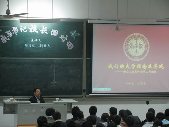 张君安副校长从大学的历史及演变、现代大学理念、西安工大的办学理念、我们的实践、我们倡导的刻苦学习境界以及我们的不足等六个方面进行了讲述,详细地为大家介绍了中国大学、西方大学所追求的“修身励志”和“献身求真”精神,使同学们对大学的历史、演变及中西方大学的理念有了深入的了解。他对西安工大的校训、办学理念、办学传统、办学定位及办学模式进行了解读,并谈了在具体实践中的认识和体会,讲述了学习中所追求的三重境界,让学生更加透彻的了解九游网页版登录入口的办学特色和办学理念,使广大学员更深层次的认识大学教育及发展、明确刻苦学习的境界,不仅使同学们对本校有了更深刻的认识,也使大家对今后的学习生活及人生规划有了明确的目标。他还以发展和求实的态度谈了西安工大在发展中存在的不足,倡导所有师生共同努力为促进学校的大发展做出自己的贡献。