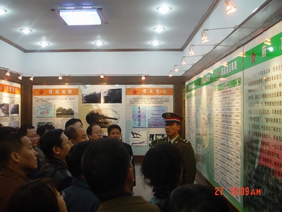 进入部队大门,一副“建设过硬拳头部队”的大红标语赫然映入眼帘,整洁、清冷的练兵场烘托出部队独有的威严。在营长的陪同下,大家首先参观了有着光荣历史的装甲步兵连一连的连史馆。这是一支具有光荣传统的红军连队,前身是1928年成立于井冈山革命根据地的莲花游击赤卫队的一部分,在战争年代参加过湘、鄂、黔根据地的创建,二万五千里长征,抗击日寇以及辽沈、平津战役,中华人民共和国成立后先后参加了解放大西南、湘西剿匪、抗美援朝等战役战斗,被授予了多项荣誉称号,七次荣立一等功。在讲解员的引导下,干部们观看了一连在炮火纷飞的岁月里保卫祖国的珍贵历史照片。