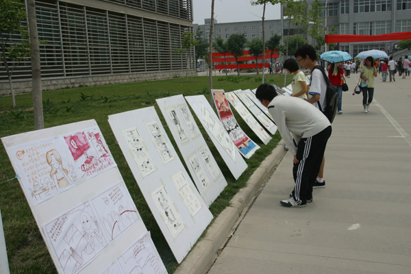 (本网讯)6月10、11日,由校党委宣传部主办、艺术与传媒学院承办的 “珍爱生命,创建平安校园”主题漫画展在未央校区图书馆南侧展出。