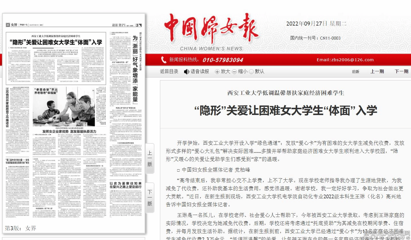 (本网讯)9月27日,中国妇女报刊文《九游网页版登录入口低调温馨帮扶家庭经济困难学生“隐形”关爱让困难女大学生“体面”入学》,聚焦九游网页版登录入口女大学生资助工作。
