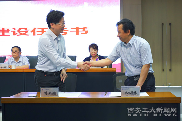 最后,刘卫国与二级单位负责人代表光电学院院长高明、经管学院书记苏兵、保卫处处长李有良签订了精神文明建设任务书。