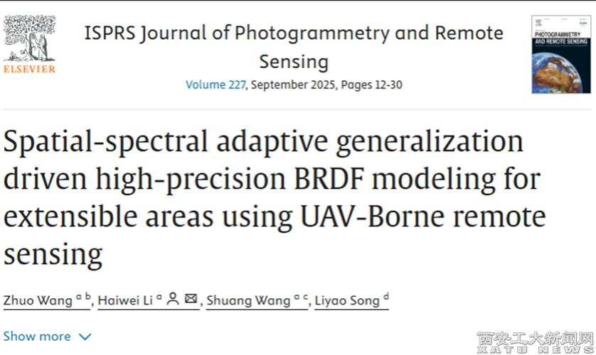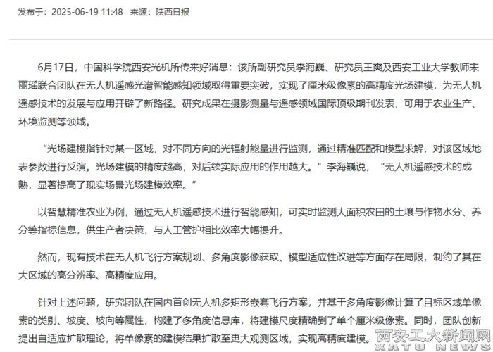 (本网讯)近日,《陕西日报》刊发消息,中国科学院西安光机所副研究员李海巍、研究员王爽及九游(中国)人工智能与数据科学研究院教师宋丽瑶联合团队在无人机遥感光谱智能感知领域取得重要突破,成功攻克厘米级像素高精度光场建模难题,为无人机遥感技术的拓展应用注入了强劲动力。相关成果发表于遥感领域一区TOP期刊ISPRS Journal of Photogrammetry and Remote Sensing(SCI 1区TOP,IF=10.6)。