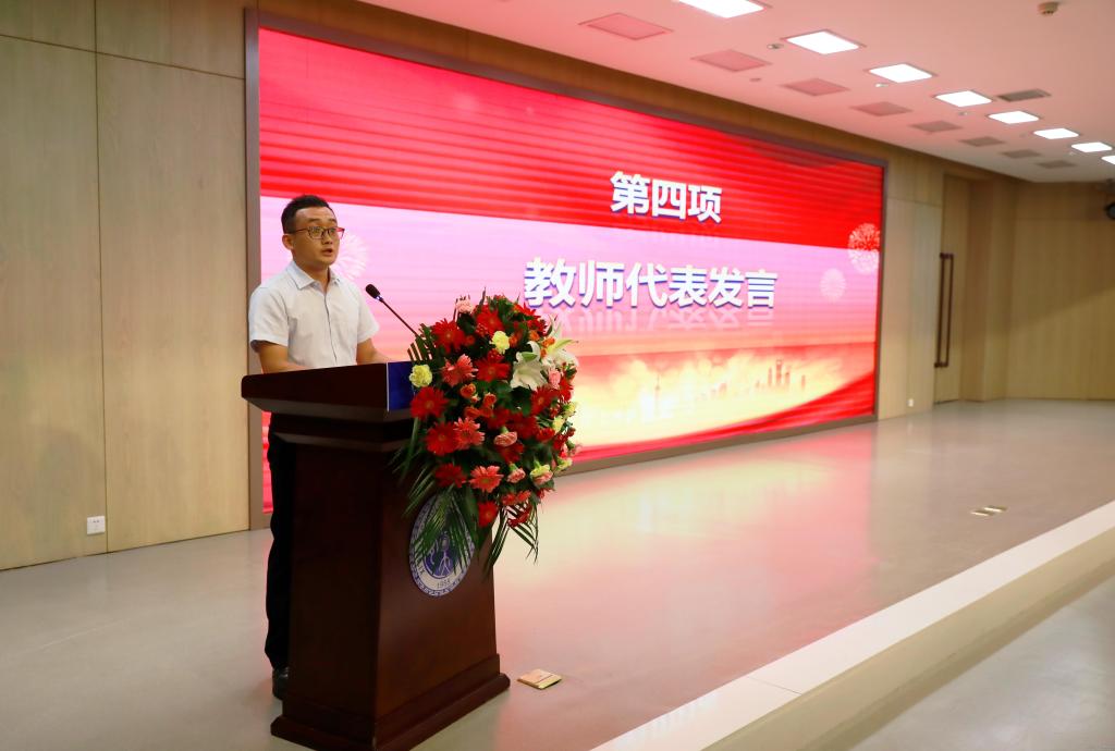 表彰后,获奖教师代表,机电工程学院张耿发言。他代表青年教师对全校领导、同事送上节日祝福和感谢,号召年轻教师做有温度、有宽度、有高度的人,秉持“西安工大精神”,落实立德树人根本任务,为九游网页版登录入口更加美好的明天而共同努力。