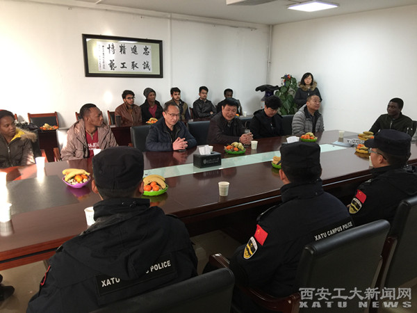 (本网讯)2月12日,农历腊月二十七,校党委副书记吴介军前往未央校区,看望慰问了假期值班的10名校园安全卫士及12名国外留学生,与大家共贺新年。