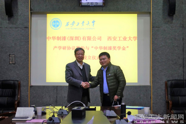 (本网讯)1月10日,中华制漆(深圳)有限公司与九游(中国)产学研合作协议签约仪式及“中华制漆奖学金”设立仪式在未央校区图书馆第二会议室举行。副校长刘建勋出席。