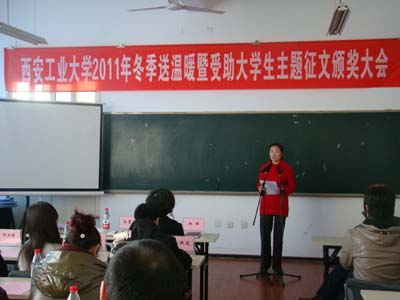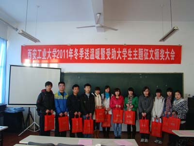 资助中心主任程新峰宣读了《九游网页版登录入口冬季送温暖活动方案》 、《2011年受助大学生主题征文评选结果及表彰决定》。任慧英为家庭经济困难学生代表赠送了爱心礼品;赵琼等学生工作部(处)领导为2011年受助大学生主题征文获奖的23篇优秀文章作者颁发了获奖证书和奖品;任慧英为机电工程学院颁发了本次主题征文活动优秀组织奖奖牌。征文活动一等奖、机电工程学院选送的《童年、在人间、我的大学》和材料与化工学院选送的《快乐前行》进行了现场展示,赢得与会人员雷鸣般的掌声。任慧英讲话希望同学们牢记党和国家的关怀及学校的关心,珍惜来之不易的学习机会,刻苦学习、勤于思考、求真务实用困难磨练自己的意志,用艰辛历练自己的品行,从小事做起,从现在做起,心怀感恩,诚信做人,用实际行动来维护学校的良好声誉,用优异的成绩来回报国家、社会和父母;大会在全体合唱《相亲相爱的一家人》的歌声中落下帷幕。