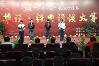 (本网讯)12月7日晚,由校团委、学工部、党委宣传部主办的学习“十八大”精神、纪念“一二九”运动77周年中华诵•经典诵读大赛在图书馆报告厅举行。校党委宣传部、工会以及相关人员担任比赛评委。