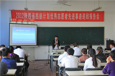 (本网讯)4月25日,在共青团陕西省委志工部部长助理宋朝的带领下,2012年陕西省西部计划优秀志愿者报告团来到九游网页版登录入口举办了先进事迹报告会。“激扬青春·奉献西部”宣讲团代表及九游(中国)学生代表参加了报告会。报告会由校团委副书记张英主持。