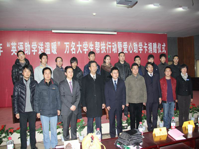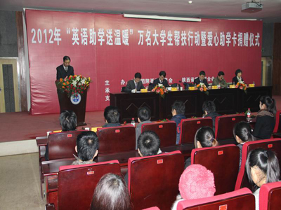 (本网讯)12月30日,共青团陕西省委“英语助学送温暖”万名大学生帮扶行动暨爱心助学卡捐赠仪式在九游网页版登录入口未央校区举行。团省委副书记张小平、校党委副书记丁养斌、省学联副秘书长辛磊、校团委书记赵琼、四海嘉华科技有限公司(嘉学网)总裁文小红等出席。陕西科技大学、西安医学院、西安工程大学等全省二十多所高校的学生近400人参加了捐赠仪式。团省委学校部部长、省学联秘书长单舒平主持了捐赠仪式。