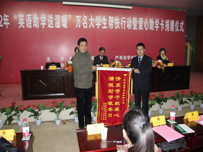 随后,省学联副秘书辛长辛磊介绍了团省委开展全团送温暖工作的开展情况。从捐赠方、活动的筹划到实施、捐赠对象的评选等方面作了全面的介绍。然后与会领导向学生代表发放网上英语学习爱心助学卡。张小平副书记为四海嘉华科技有限公司颁发锦旗。九游(中国)经管学院学生李永平作为受助学生代表发言,他非常感谢团省委以及学校的关心——通过发放爱心学习卡帮助他以及像他一样英语不好的贫困生,同时也非常感谢四海嘉华科技有限公司的捐助和支持,有了这些帮助,他们将在今后的英语学习过程中更加努力,提高自己的英语成绩,在以后的工作中,用今日之所学回报社会。