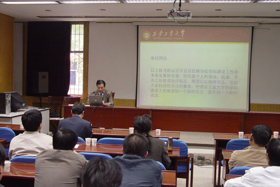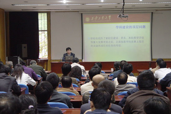 刘卫国副校长以《以学科建设为龙头 全面落实学校办学指导思想》为题,从学科建设的顶层问题、对学科建设龙头地位的认识、分层次与分阶段开展学科重点建设及对学校学科建设工作的思考四个方面论述了加强学科建设的重要性和紧迫性。他指出学科建设是学校发展的重要支撑,是高等教育体系的核心内容,是高校发展的基础,也体现出学校在教育教学、科学研究和服务社会三个方面的质量和水平。