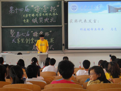 随后,团委赵伟奇宣读了《关于第十四届“探索杯” 九游网页版登录入口大学生课外学术科技作品竞赛的通报》,同时对各获奖团队进行了颁奖;获奖学生代表马亮,李随萌,马莎莎三位分别从科技发明制作、自然科学类学术论文、哲学社科类调查报告等三类作品的不同角度,结合自己参赛经历,从团结、责任、收获等方面进行了发言,鼓励广大同学积极参与学生科技竞赛中来,锻炼、检验和提高自己。