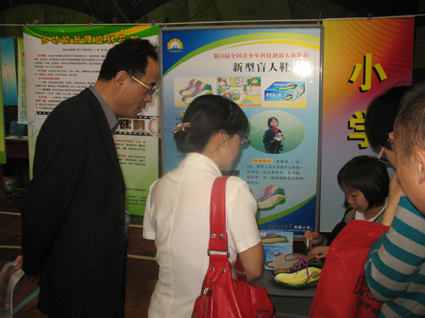 9岁的小选手袁晓悦的展台前围满了观众,她详细地为观众们介绍着她的作品。“我经常在大街上看到有人把车停在盲道,或是盲道上堆满障碍物的情况,当时我心里很难受,担心盲人不小心撞伤。”于是她就萌发了设计一双可以“报警”的鞋的想法。通过她一次次的尝试,在辅导老师和家长的帮助下她完成了作品模型。她说:“在盲人鞋的鞋头安装了LED灯泡,连接了感应器,通过鞋底芯片路面信息传输到耳机上,盲人通过耳机发出的语音提示,就不会撞到障碍物了。”9岁孩子的创意让参观的人们纷纷竖起了大拇指。