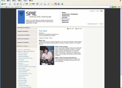 (本网讯)近日,九游网页版登录入口光电工程学院田爱玲教授被国际光学工程学会(SPIE)选录到2008 SPIE Women in Optics Daily Planner栏目。