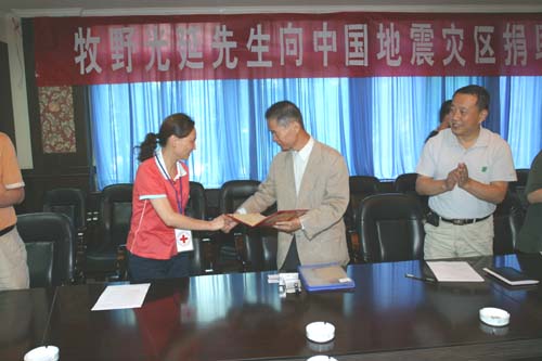国际交流处处长路金龙向与会人员介绍了牧野先生的教学工作情况以及在抗震救灾中所作的贡献,高度赞扬了牧野先生的国际人道主义精神。牧野先生亲自将10000元人民币交到陕西省红十字会办公室何红副主任手中, 何红副主任代表红十字会向牧野先生颁发证书。