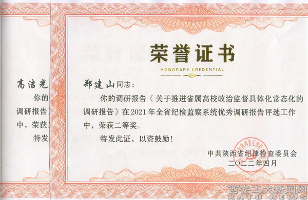 (本网讯)近日,陕西省纪委办公厅下发《中共陕西省纪委关于表彰2021年全省纪检监察系统优秀调研报告获奖个人和获奖集体的决定》(陕纪发〔2022〕3号)。校纪检监察机构组织撰写的《关于推进省属高校政治监督具体化常态化的调研报告》荣获全省纪检监察系统优秀调研报告二等奖,是二等奖中唯一获奖高校,在全省高校中获奖等次位列最高。