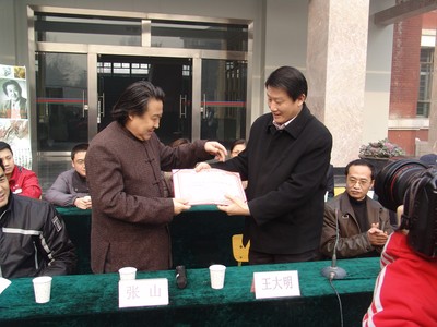 12月20日下午,“十八高校学生书画作品巡展”分会场开幕式在西安工大北信学院举行。仪式上,北信学院副院长李建安致欢迎辞,党委副书记王大明为张山先生颁发了客座教授聘书。