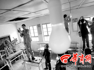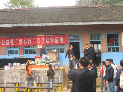一到学校,大家就忙着拉杆架线,将带来的照明设备安装到各个教室,并将学习用品、体育器械、音像设备捐献给该校。公益爱心社是西安工大人文学院学生自发组织成立的,以倡导公益爱心为宗旨,有近20名大学生都参与到这个社团。