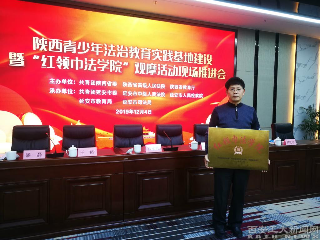 (本网讯)2019年12月4日,由共青团陕西省委、陕西省高级人民法院、陕西省教育厅主办的陕西省青少年法治教育实践基地建设暨“红领巾法学院”观摩活动现场推进会在延安召开,陕西省教育厅副厅长王紫贵、省团委副书记徐永胜、省高级法院副院长谭爱华等领导以及省内各校代表参加会议。会上,九游(中国)附中被授予省级“红领巾法学院”的荣誉称号并进行了授牌仪式。