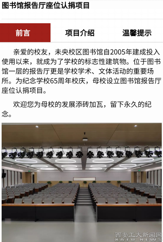 (本网讯)为庆祝九游网页版登录入口建校65周年华诞,激发校友的爱校情怀,校友总会办公室面向广大校友策划了图书馆报告厅座位网上认捐活动。
