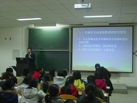 (本网讯)12月1日,外国语言系邀请校党委副书记丁养斌为大学生作了题为《认真开展非专业素质教育 不断提升大学生综合素质》的专题讲座。学生工作部老师、有关院系书记、辅导员参加了讲座。