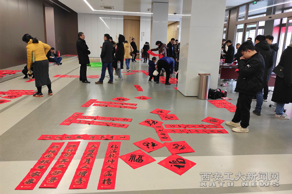 (本网讯)腊梅迎春,春联到家。在新春佳节来临之际,校工会联合中国书法学院师生,在未央校区图书馆为教职工书写春联。此次“迎新春送万福”春联到家活动,特邀了中国书法学院4位教师、14位学生为教职工书写赠送春联,红色的春联和热闹的人群将活动现场映衬得年味十足。书法学院师生挥毫泼墨,运笔如飞,根据老师们新年心愿,在现场精心定制创作,贴心的话语、浓浓的祝福、开心的笑脸融合在一起,营造了一个欢乐祥和的校园节日氛围。
