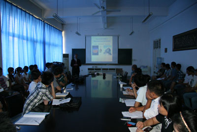 报告会分别在28、29日上午进行, Resagk博士介绍了他所在的德国伊尔梅瑙工业大学及其研究团队,针对专题分别讲述了洛伦兹力测速仪的基本原理及其实验操作模式,以及光学流体测量的相关内容和实际操作经验,并结合PPT动画演示了实验过程,对实验结果进行了分析,同时对相关研究方向的现状及发展前景做了说明。报告会上,与会师生与Resagk博士针对相关学科内容进行了亲切交流,现场发言踊跃、气氛热烈。