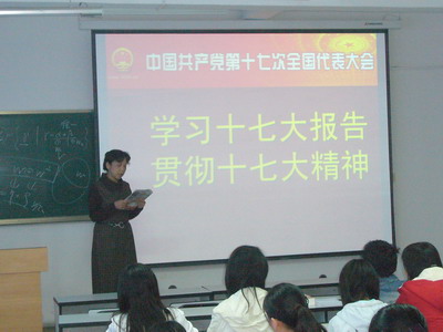 研究生部党总支书记雷亚萍教授对十七大报告的内容作了精彩的讲解。她指出,十七大是在我国改革发展关键阶段召开的一次十分重要的会议,十七大报告是马克思主义一脉相承和与时俱进的统一,是科学理论和具体实践的结合,既展示了我们党政治上的坚定和理论上的成熟,也增强了党的路线、方针、政策和各项措施的针对性、可操作性和实效性。胡锦涛同志所作的报告内涵丰富、思想深刻、意义深远,是指引全国各族人民继续为实现全面建设小康社会目标而奋斗的行动纲领,体现了时代的新要求和人民群众的新期待。