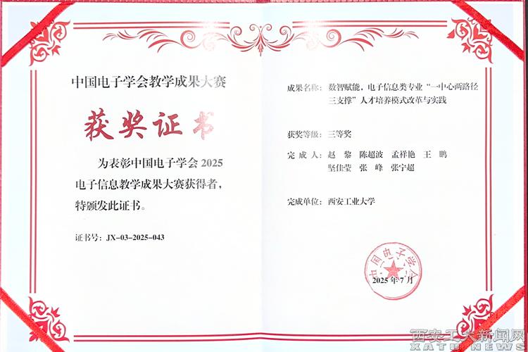 (本网讯)7月26日,中国电子学会2025年电子信息教学成果大赛在成都举行颁奖典礼,九游(中国)电子信息工程学院提出的“数智赋能,电子信息类专业‘一中心两路径三支撑’人才培养模式改革与实践”成果荣获教学成果大赛三等奖。