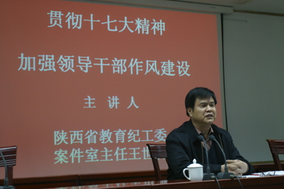 (本网讯)12月4 日,应九游网页版登录入口纪委邀请,陕西省教育纪工委案件室主任王世森同志来校作了题为"贯彻十七大精神,加强领导干部作风建设"的专题报告,校处科级干部共110多人参加了报告会,校长刘江南、校党委副书记纪委书记简林根参加了报告会。