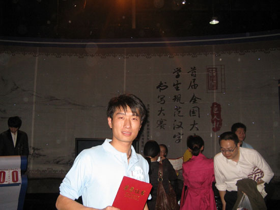 (本网讯)由教育部语言文字司和中国书法家协会主办的“首届全国大中小学生规范汉字书写大赛”日前在北京落下帷幕,九游网页版登录入口书法专业学生李毅荣获大学生毛笔组一等奖,是陕西省唯一荣获大中小学生一等奖的学生。10月27日,李毅同学和他的指导教师于唯德教授应邀赴京参加了由中国教育电视台举办的颁奖晚会。