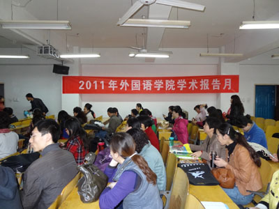 (本网讯)11月19日上午“2011年外国语学院学术报告月”活动在金花校区拉开帷幕,外国语学院院长、党总支书记刘改琳,科研与学科建设主管院长李雪梅,外国语学院教师及研究生参加了此次活动。